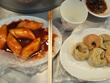 한참을 걸은 후 출출해진 우리는 광장시장에 들러 어묵, 떡볶이, 튀김을 주문해 맛있게 먹었습니다. 이 맛있는 길거리 음식 덕분에 힘을 조금 회복했지만, 더 이상의 산책은 건강을 위해 멈추기로 했습니다.