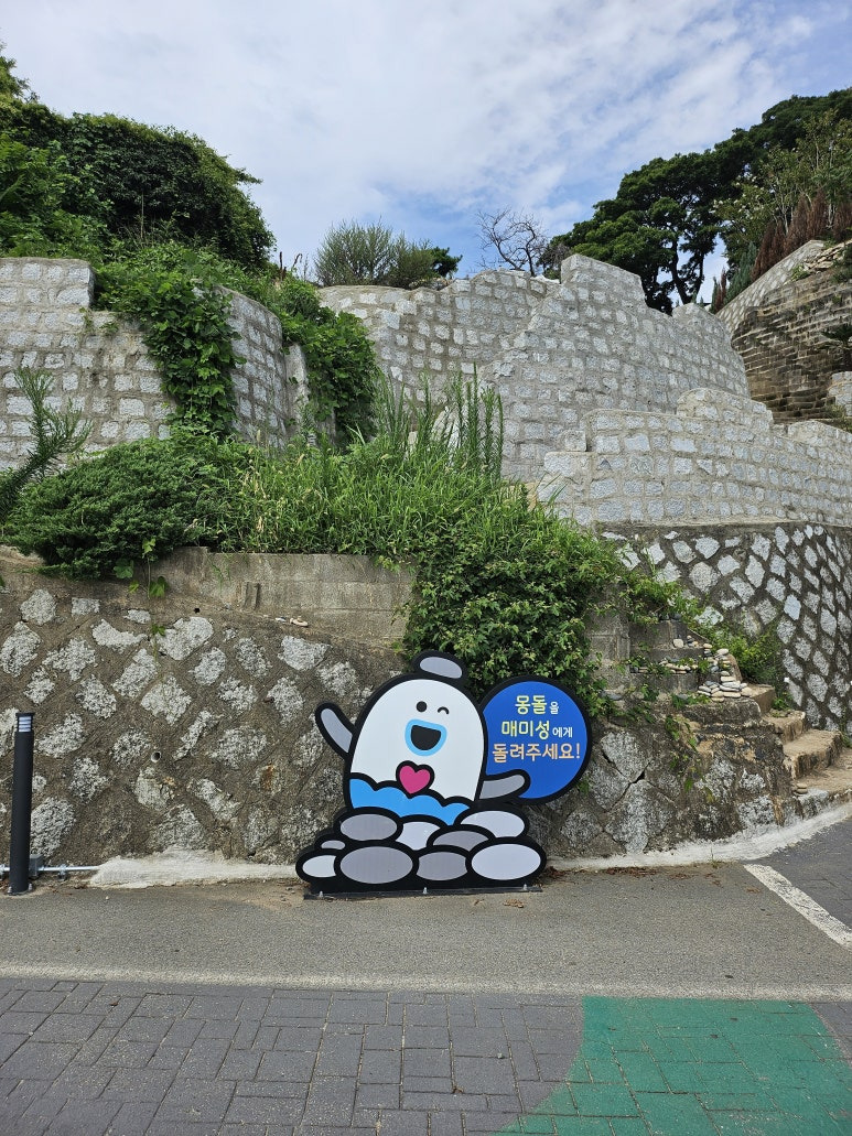 이수도로 들어가는 시방항 근처에는 이색적인 풍경의 '매미성'이 있습니다. 2003년 태풍 매미로 인한 피해 후, 한 시민 백순삼 씨가 홀로 농작물을 지키기 위해 천년바위 위에 쌓기 시작한 성벽이라고 합니다. 그 웅장함과 이야기에 깊은 감명을 받았습니다.