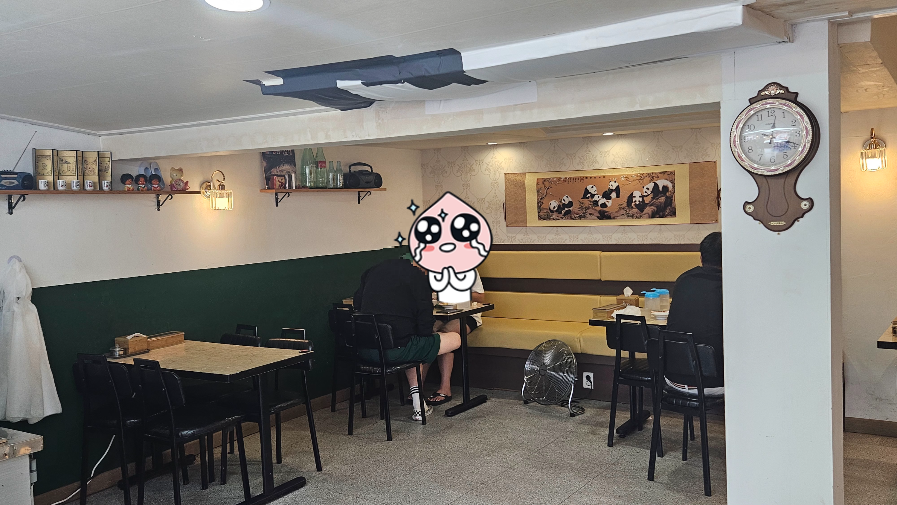 실내로 들어서면 노란 가죽 소파, 벽에 걸린 팬더 그림, 아날로그 시계, 그리고 오래된 소품들이 반겨줍니다.