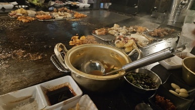 철판 위에서 불길이 화르르 올라오는데 가족 모두 눈이 커지더라고요. 불쇼만으로도 이 집이 왜 유명한지 알겠다는 느낌!