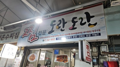 시장 특유의 정겨운 공기 속에 자리 잡은 식당 **‘도란도란’**이 눈에 들어옵니다.